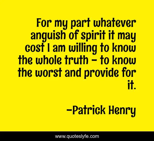 This page presents the quote "For my part whatever anguish of spirit it may cost I am willing to know the whole truth - to know the worst and provide for it.". Author of this quote is Patrick Henry. .