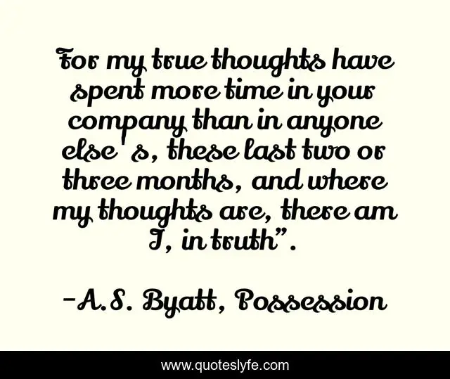 This page presents the quote "For my true thoughts have spent more time in your company than in anyone else's, these last two or three months, and where my thoughts are, there am I, in truth".". Author of this quote is A.S. Byatt, Possession. This quote is about soul-mate, thoughts, truth,.