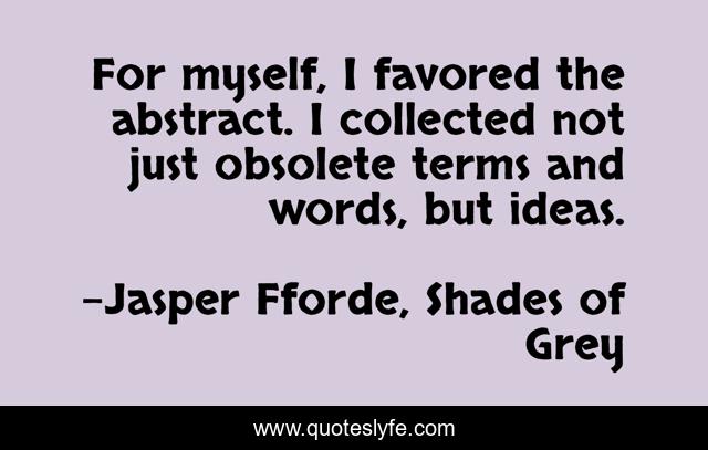 This page presents the quote "For myself, I favored the abstract. I collected not just obsolete terms and words, but ideas.". Author of this quote is Jasper Fforde, Shades of Grey. This quote is about terms, phrases, abstract, ideas, obsolete, collect, collections, words,.