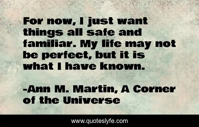 This page presents the quote "For now, I just want things all safe and familiar. My life may not be perfect, but it is what I have known.". Author of this quote is Ann M. Martin, A Corner of the Universe. This quote is about life, comfort, safety,.