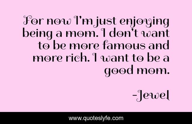This page presents the quote "For now I'm just enjoying being a mom. I don't want to be more famous and more rich. I want to be a good mom.". Author of this quote is Jewel. This quote is about good, mom, rich,.