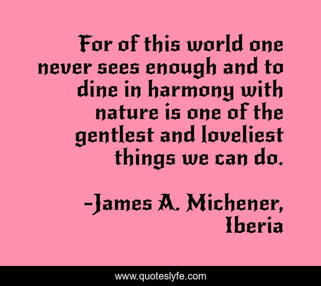This page presents the quote "For of this world one never sees enough and to dine in harmony with nature is one of the gentlest and loveliest things we can do.". Author of this quote is James A. Michener, Iberia. .
