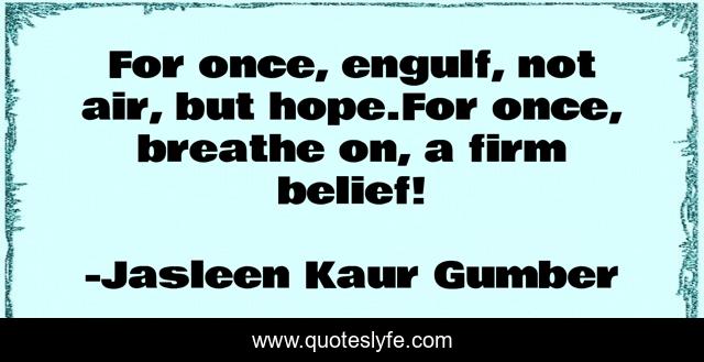 This page presents the quote "For once, engulf, not air, but hope.For once, breathe on, a firm belief!". Author of this quote is Jasleen Kaur Gumber. This quote is about breathe, faith, life, strength, power, philosophy, humans, poetry, wisdom,.