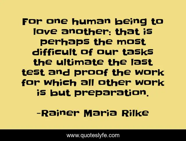 This page presents the quote "For one human being to love another: that is perhaps the most difficult of our tasks the ultimate the last test and proof the work for which all other work is but preparation.". Author of this quote is Rainer Maria Rilke. .