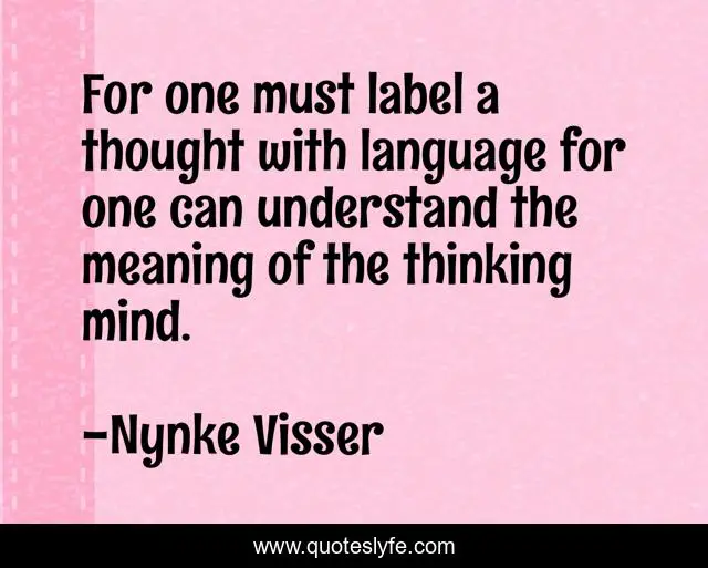 This page presents the quote "For one must label a thought with language for one can understand the meaning of the thinking mind.". Author of this quote is Nynke Visser. This quote is about language, thinking, philosophy, thoughts, inspiritational, change, new-age,.