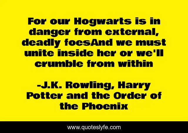 This page presents the quote "For our Hogwarts is in danger from external, deadly foesAnd we must unite inside her or we'll crumble from within". Author of this quote is J.K. Rowling, Harry Potter and the Order of the Phoenix. This quote is about harry-potter, j-k-rowling,.