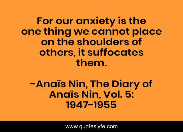 This page presents the quote "For our anxiety is the one thing we cannot place on the shoulders of others, it suffocates them.". Author of this quote is Anaïs Nin, The Diary of Anaïs Nin, Vol. 5: 1947-1955. .