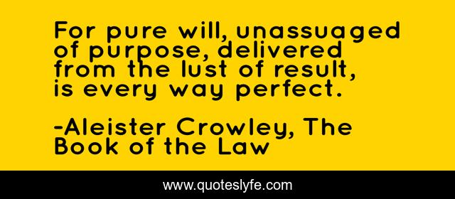 This page presents the quote "For pure will, unassuaged of purpose, delivered from the lust of result, is every way perfect.". Author of this quote is Aleister Crowley, The Book of the Law. .