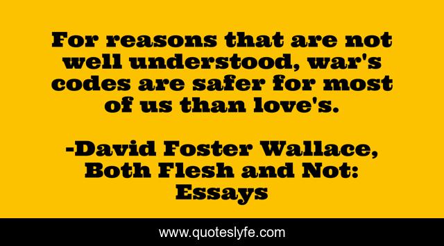 This page presents the quote "For reasons that are not well understood, war's codes are safer for most of us than love's.". Author of this quote is David Foster Wallace, Both Flesh and Not: Essays. This quote is about meaning, love, war, affection,.