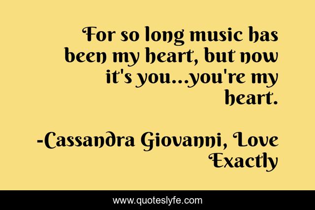This page presents the quote "For so long music has been my heart, but now it's you...you're my heart.". Author of this quote is Cassandra Giovanni, Love Exactly. This quote is about romance, musician, love-story, im-with-the-band,.