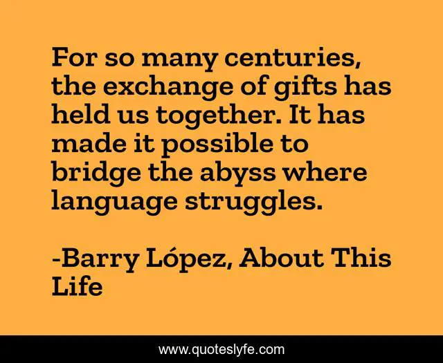 This page presents the quote "For so many centuries, the exchange of gifts has held us together. It has made it possible to bridge the abyss where language struggles.". Author of this quote is Barry López, About This Life. This quote is about gifts, giving, language,.
