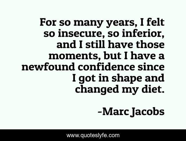 This page presents the quote "For so many years, I felt so insecure, so inferior, and I still have those moments, but I have a newfound confidence since I got in shape and changed my diet.". Author of this quote is Marc Jacobs. This quote is about moments, confidence, shape,.