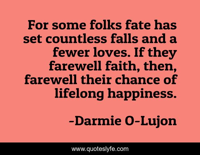 This page presents the quote "For some folks fate has set countless falls and a fewer loves. If they farewell faith, then, farewell their chance of lifelong happiness.". Author of this quote is Darmie O-Lujon. This quote is about challenges, courageousness, beauty, dreams,.