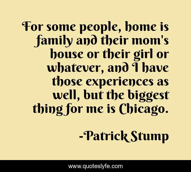 This page presents the quote "For some people, home is family and their mom's house or their girl or whatever, and I have those experiences as well, but the biggest thing for me is Chicago.". Author of this quote is Patrick Stump. This quote is about home, girl, family,.