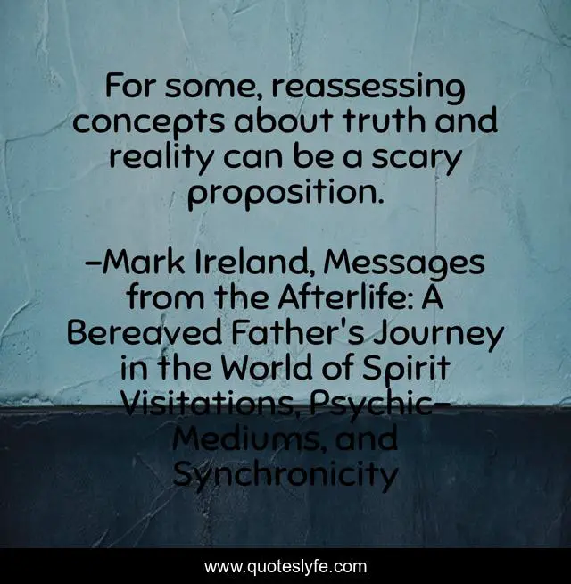 This page presents the quote "For some, reassessing concepts about truth and reality can be a scary proposition.". Author of this quote is Mark Ireland, Messages from the Afterlife: A Bereaved Father's Journey in the World of Spirit Visitations, Psychic-Mediums, and Synchronicity. This quote is about afterlife, psychic-medium,.