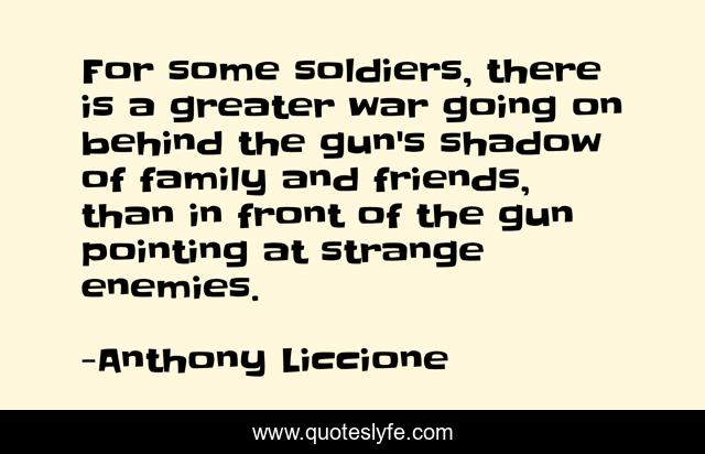 This page presents the quote "For some soldiers, there is a greater war going on behind the gun's shadow of family and friends, than in front of the gun pointing at strange enemies.". Author of this quote is Anthony Liccione. This quote is about love, family, personhood, society, kill, depression, suicide, end, silent,.