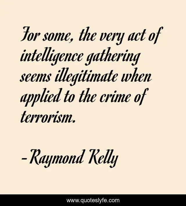 This page presents the quote "For some, the very act of intelligence gathering seems illegitimate when applied to the crime of terrorism.". Author of this quote is Raymond Kelly. This quote is about terrorism, gathering, crime,.