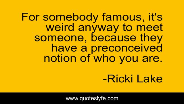This page presents the quote "For somebody famous, it's weird anyway to meet someone, because they have a preconceived notion of who you are.". Author of this quote is Ricki Lake. This quote is about weird, someone,.