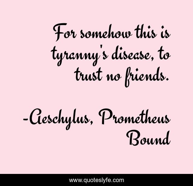 This page presents the quote "For somehow this is tyranny's disease, to trust no friends.". Author of this quote is Aeschylus, Prometheus Bound. This quote is about tyranny, trust, friends, disease,.