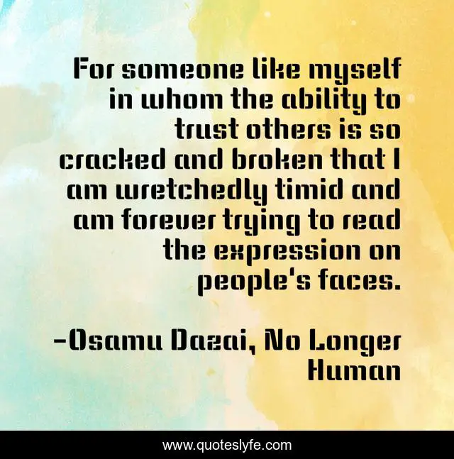 This page presents the quote "For someone like myself in whom the ability to trust others is so cracked and broken that I am wretchedly timid and am forever trying to read the expression on people's faces.". Author of this quote is Osamu Dazai, No Longer Human. This quote is about life, social-anxiety, social-awkwardness, loneliness, human-relationships, depression, fear, trust, friendship,.