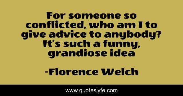 This page presents the quote "For someone so conflicted, who am I to give advice to anybody? It’s such a funny, grandiose idea". Author of this quote is Florence Welch. This quote is about florence-welch, musicians, music, florence-and-the-machine,.