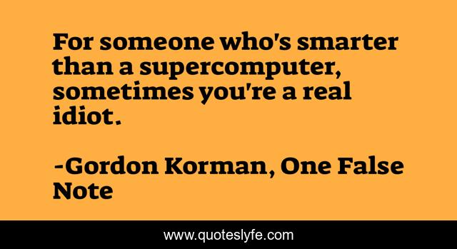 This page presents the quote "For someone who's smarter than a supercomputer, sometimes you're a real idiot.". Author of this quote is Gordon Korman, One False Note. This quote is about stupidity, the39clues, ian-kabra, natalie-kabra,.