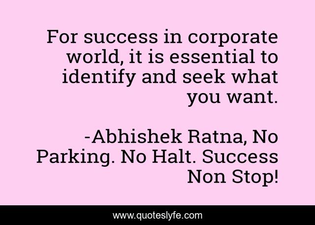 This page presents the quote "For success in corporate world, it is essential to identify and seek what you want.". Author of this quote is Abhishek Ratna, No Parking. No Halt. Success Non Stop!. This quote is about career, success-self-improvement, success-strategies, career-success, careers, success-in-business,.