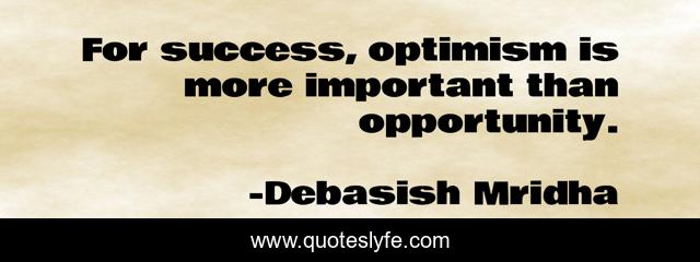 This page presents the quote "For success, optimism is more important than opportunity.". Author of this quote is Debasish Mridha. This quote is about life, love, knowledge, inspirational, intelligence, philosophy, wisdom, quotes, affection,.