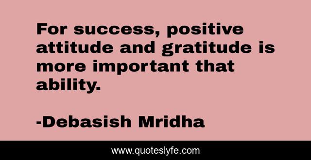This page presents the quote "For success, positive attitude and gratitude is more important that ability.". Author of this quote is Debasish Mridha. This quote is about gratitude, debasish, ability, success, mridha, philosophy, debasish-mridha, positive-attitude,.
