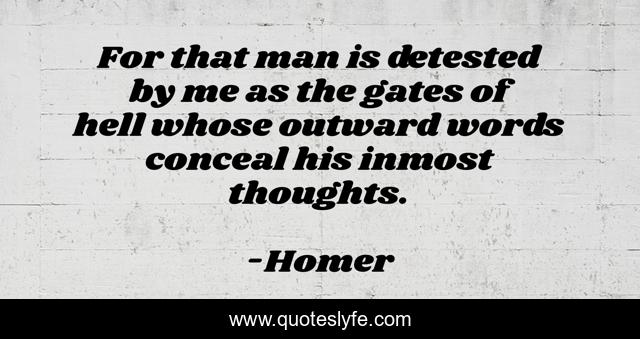 This page presents the quote "For that man is detested by me as the gates of hell whose outward words conceal his inmost thoughts.". Author of this quote is Homer. .