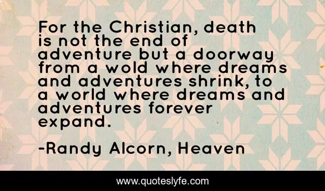 This page presents the quote "For the Christian, death is not the end of adventure but a doorway from a wold where dreams and adventures shrink, to a world where dreams and adventures forever expand.". Author of this quote is Randy Alcorn, Heaven. This quote is about enthusiasm, heaven, christian, inspirational, death,.
