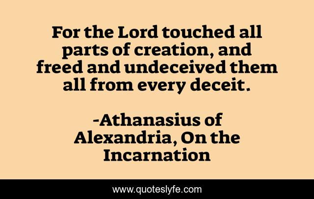 This page presents the quote "For the Lord touched all parts of creation, and freed and undeceived them all from every deceit.". Author of this quote is Athanasius of Alexandria, On the Incarnation. This quote is about creation, incarnation, jesus,.