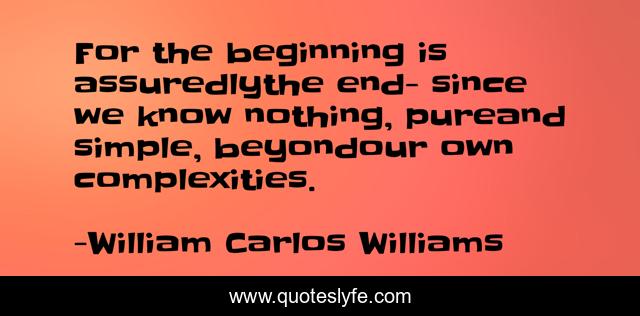 This page presents the quote "For the beginning is assuredlythe end- since we know nothing, pureand simple, beyondour own complexities.". Author of this quote is William Carlos Williams. .