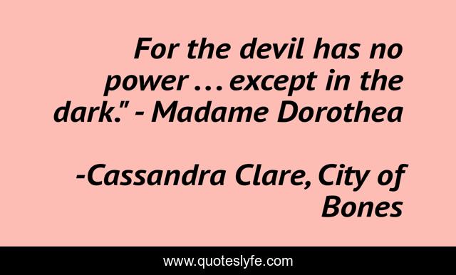 This page presents the quote "For the devil has no power . . . except in the dark." - Madame Dorothea". Author of this quote is Cassandra Clare, City of Bones. This quote is about devil, the-shadowhunter-chronicles, darkness, city-of-bones, madame-dorothea, shadowhunters, cassandra-clare, the-mortal-instruments, dark,.