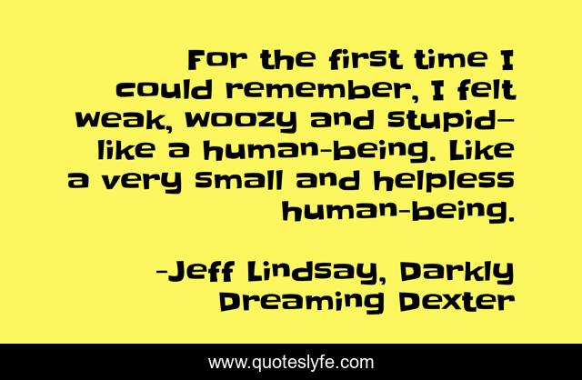 This page presents the quote "For the first time I could remember, I felt weak, woozy and stupid— like a human-being. Like a very small and helpless human-being.". Author of this quote is Jeff Lindsay, Darkly Dreaming Dexter. This quote is about small, helpless, weak, human,.