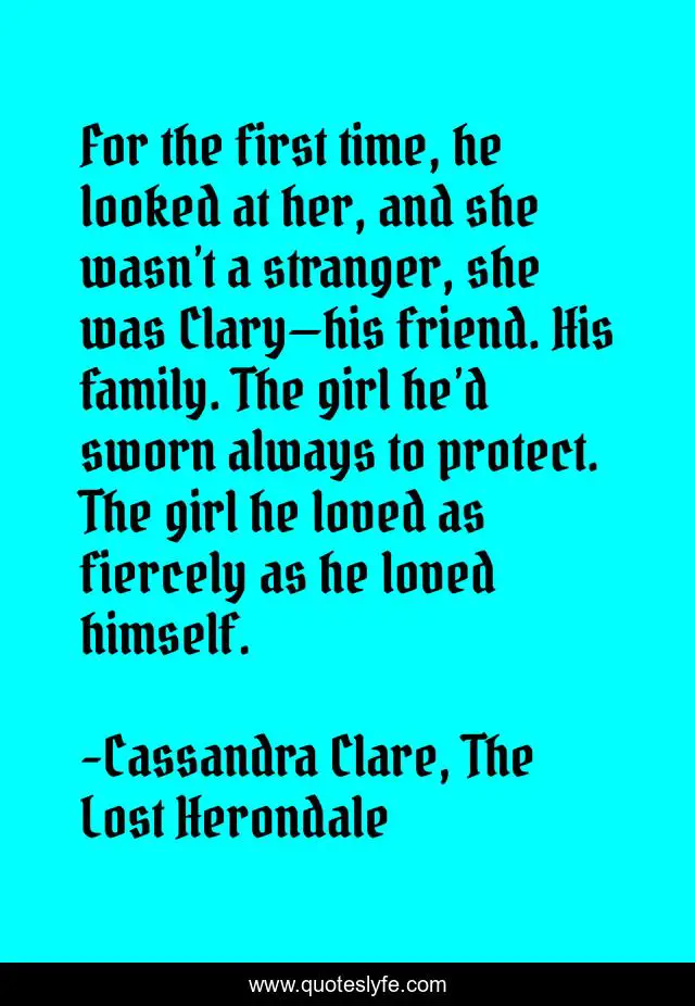 This page presents the quote "For the first time, he looked at her, and she wasn’t a stranger, she was Clary—his friend. His family. The girl he’d sworn always to protect. The girl he loved as fiercely as he loved himself.". Author of this quote is Cassandra Clare, The Lost Herondale. This quote is about protect, love, family, clary-fray, bestfriends, friend, simon-lewis, affection,.