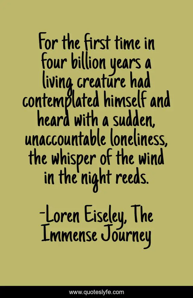 This page presents the quote "For the first time in four billion years a living creature had contemplated himself and heard with a sudden, unaccountable loneliness, the whisper of the wind in the night reeds.". Author of this quote is Loren Eiseley, The Immense Journey. This quote is about music, reeds, wind,.