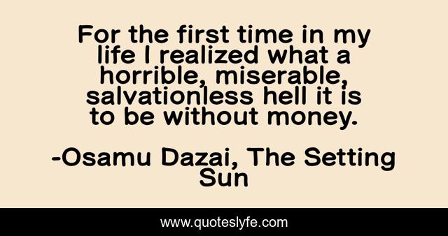 This page presents the quote "For the first time in my life I realized what a horrible, miserable, salvationless hell it is to be without money.". Author of this quote is Osamu Dazai, The Setting Sun. .