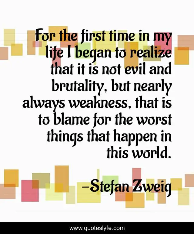 This page presents the quote "For the first time in my life I began to realize that it is not evil and brutality, but nearly always weakness, that is to blame for the worst things that happen in this world.". Author of this quote is Stefan Zweig. This quote is about life, brutality, weakness, evil, blame, worst, world, realize,.