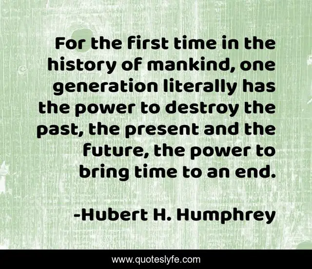 This page presents the quote "For the first time in the history of mankind, one generation literally has the power to destroy the past, the present and the future, the power to bring time to an end.". Author of this quote is Hubert H. Humphrey. This quote is about future, power, time,.