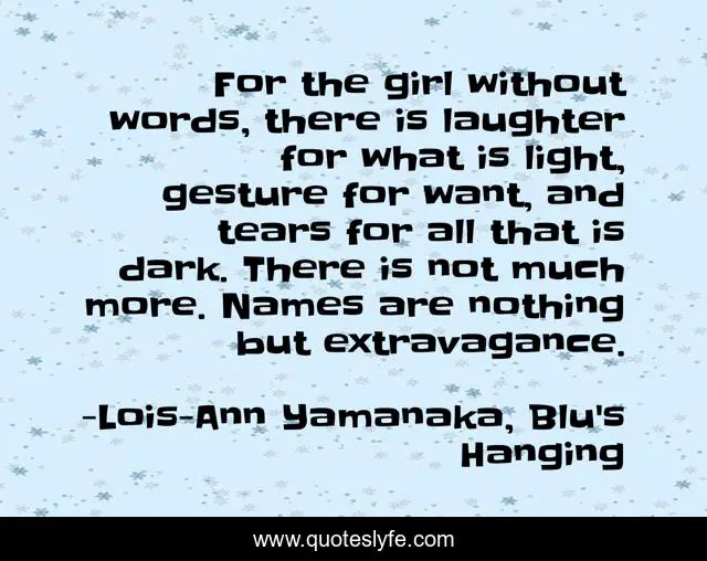 This page presents the quote "For the girl without words, there is laughter for what is light, gesture for want, and tears for all that is dark. There is not much more. Names are nothing but extravagance.". Author of this quote is Lois-Ann Yamanaka, Blu's Hanging. This quote is about asian-american, novel, fiction,.