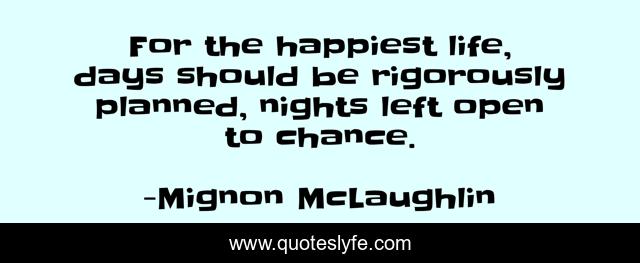 This page presents the quote "For the happiest life, days should be rigorously planned, nights left open to chance.". Author of this quote is Mignon McLaughlin. This quote is about life, planned, left,.