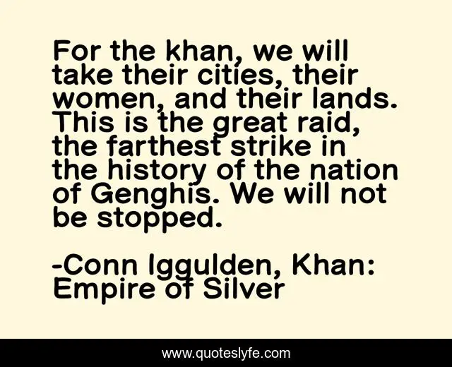 This page presents the quote "For the khan, we will take their cities, their women, and their lands. This is the great raid, the farthest strike in the history of the nation of Genghis. We will not be stopped.". Author of this quote is Conn Iggulden, Khan: Empire of Silver. This quote is about great, lands, khan, farthest, genghis, nation, history, stopped, take,.