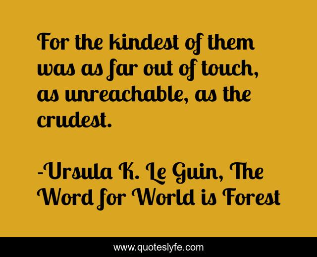 This page presents the quote "For the kindest of them was as far out of touch, as unreachable, as the crudest.". Author of this quote is Ursula K. Le Guin, The Word for World is Forest. .