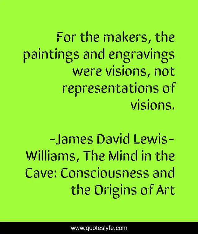 This page presents the quote "For the makers, the paintings and engravings were visions, not representations of visions.". Author of this quote is James David Lewis-Williams, The Mind in the Cave: Consciousness and the Origins of Art. This quote is about upper-palaeolithic-art, consciousness,.