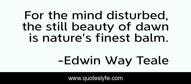 This page presents the quote "For the mind disturbed, the still beauty of dawn is nature's finest balm.". Author of this quote is Edwin Way Teale. This quote is about medical, mind, beauty,.