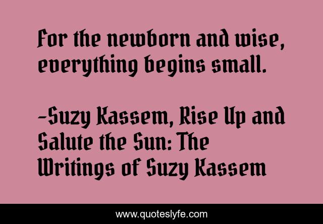 This page presents the quote "For the newborn and wise, everything begins small.". Author of this quote is Suzy Kassem, Rise Up and Salute the Sun: The Writings of Suzy Kassem. This quote is about newborn, small, everything-begins-small, wise, wisdom,.