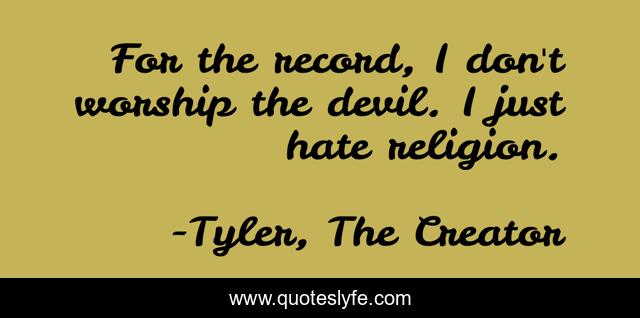 This page presents the quote "For the record, I don't worship the devil. I just hate religion.". Author of this quote is Tyler, The Creator. This quote is about devil, hate, worship,.