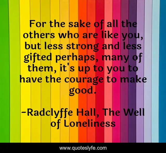 This page presents the quote "For the sake of all the others who are like you, but less strong and less gifted perhaps, many of them, it's up to you to have the courage to make good.". Author of this quote is Radclyffe Hall, The Well of Loneliness. This quote is about homophobia, courage-to-be-oneself, courage, diversity, identity,.