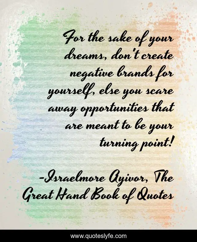 This page presents the quote "For the sake of your dreams, don't create negative brands for yourself, else you scare away opportunities that are meant to be your turning point!". Author of this quote is Israelmore Ayivor, The Great Hand Book of Quotes. This quote is about food-for-thought, turning, dream-big, point, personal-branding, create, turning-point, negative, opportunities,.